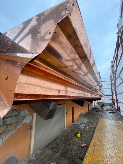 Sostituzione di canali di gronda, tubazioni pluviali, lattonerie, porzioni di coperture metalliche, lucernari, sigillature di converse e sostituzione giunti di dilatazione.
