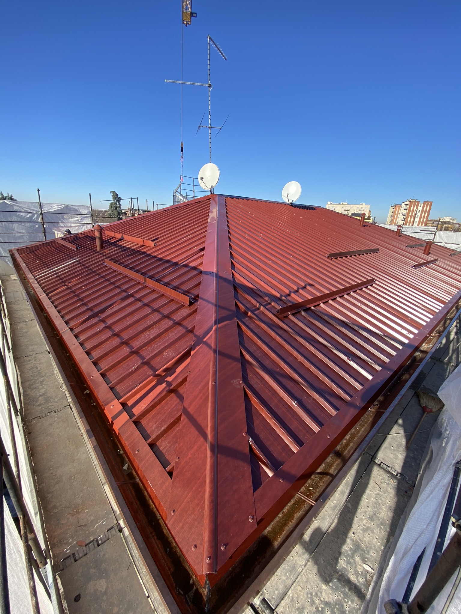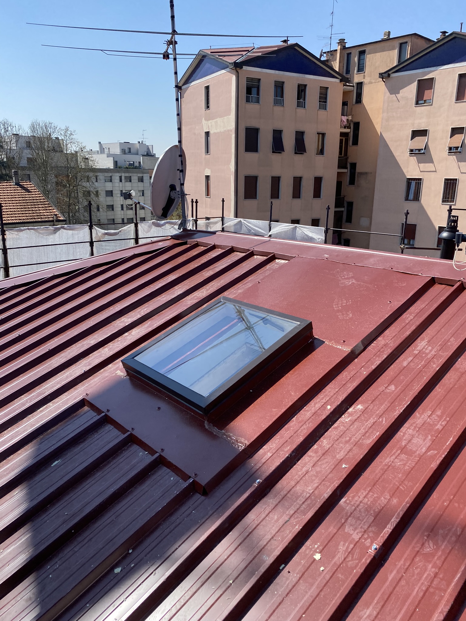 Nelle coperture civili includiamo anche la realizzazione e posa dei canali di gronda e tubazioni per lo scolo dell’acqua meteorica, la predisposizione di lucernari in policarbonato, vetroresina o in vetro e la posa della linea vita.