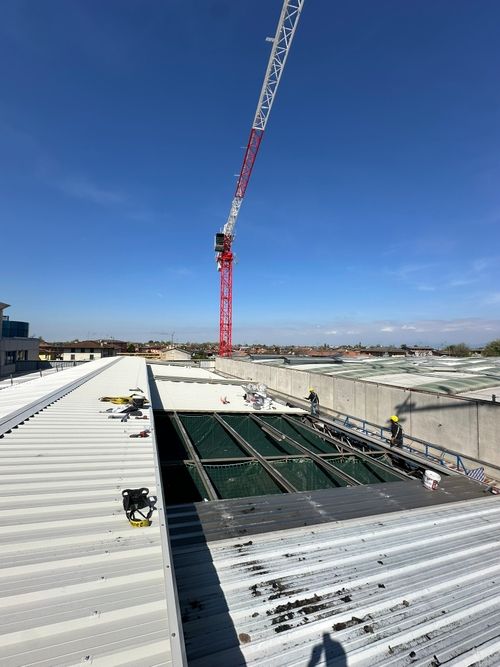 Nelle coperture industriali includiamo anche la realizzazione e posa dei canali e tubazioni per lo scolo dell’acqua meteorica, la predisposizione di lucernari in policarbonato, vetroresina o in vetro e la posa della linea vita.